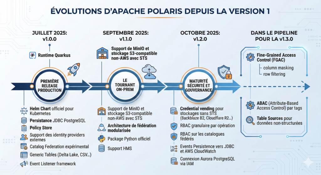 Juillet 2025 — v1.0.0 : première release production. Runtime Quarkus, Helm Chart officiel pour Kubernetes, persistance JDBC PostgreSQL, Policy Store, support des identity providers externes, Catalog Federation expérimental, Generic Tables (Delta Lake, CSV…), Event Listener framework.