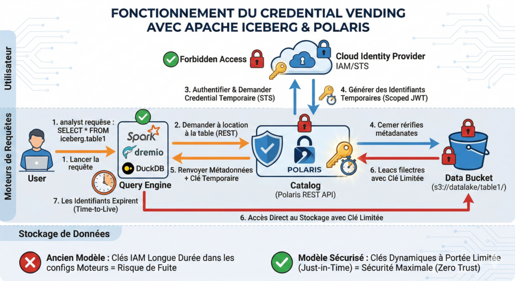 Contrôle de l’accès jusqu’au bit. Le mécanisme de credential vending de Polaris est élégant dans sa conception : lorsqu’un moteur de requête demande à accéder à des données, Polaris génère un token temporaire (via STS) qui lui donne accès au storage pour la durée de l’opération. À expiration du token, l’accès est révoqué. Ni le moteur de requête, ni les métadonnées Iceberg elles-mêmes ne portent de credentials permanents. La clé ne sort jamais de Polaris.