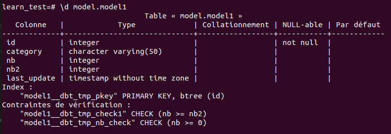 Matérialisons notre modèle dans PostgreSQL avec la commande dbt run -s model1 et regardons le résultat dans postgres :