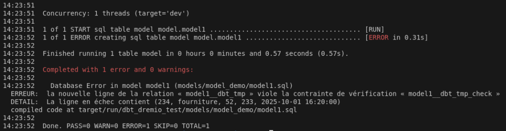 Il n’est pas possible de définir des contrats sur les modèles dont la matérialisation est ephemeral ou view. Ce n’est également pas supporté pour les modèles en python et il n’est pas possible d’en définir sur d’autres ressources comme les seeds, les sources, les snapshots, etc.