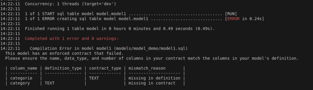 Nom de colonne qui diffère (dans le contrat on a remplacé la colonne “category” par “categorie” pour générer l’erreur) :