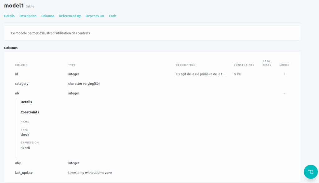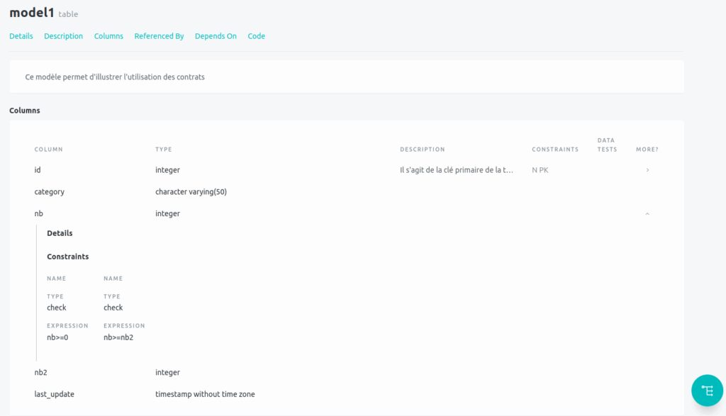 Les contrats sont définis dans un fichier yml. On y liste toutes les colonnes que doit contenir le modèle ainsi que leur type. De plus, on peut y définir des contraintes, au niveau du modèle ou au niveau d’une colonne. Voici les différentes contraintes possibles :