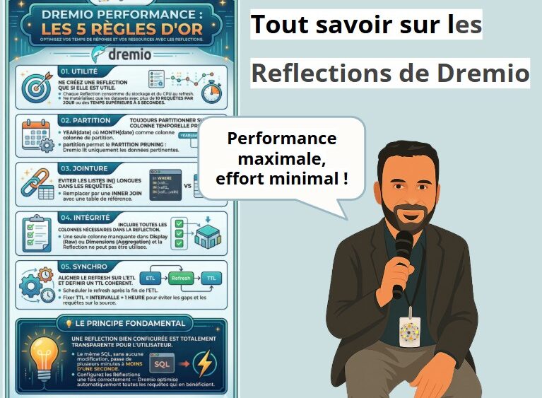 | Qu’est-ce qu’une Reflection ? Une Reflection est un jeu de données pré-calculé et stocké en format colonnaire (Parquet/Arrow) que Dremio utilise automatiquement pour accélérer les requêtes SQL. L’utilisateur écrit son SQL normalement — Dremio redirige la requête vers la Reflection sans aucune modification du code. |