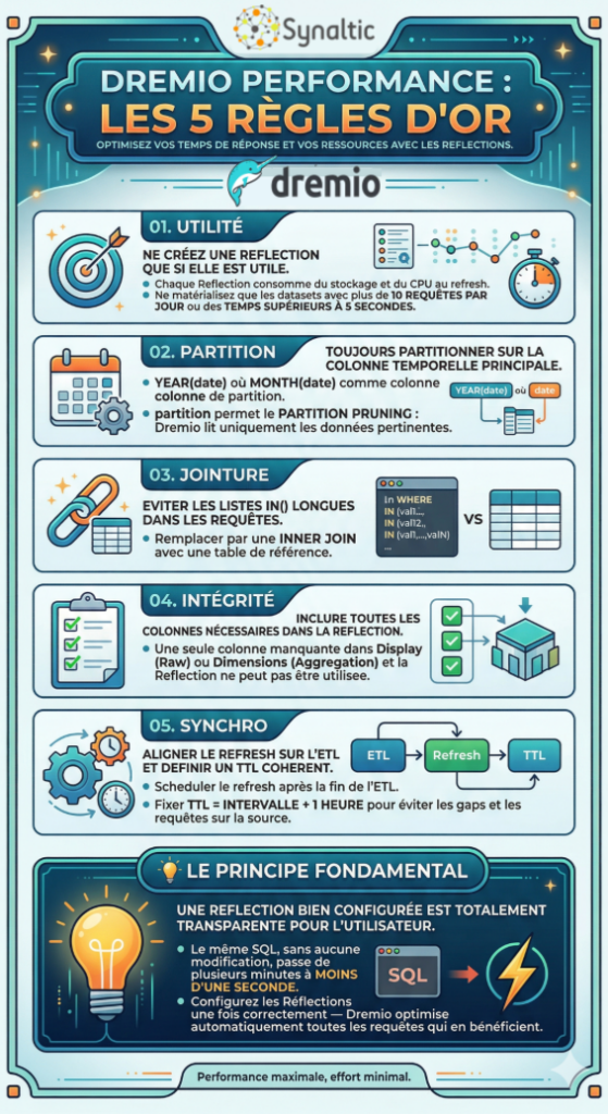 Ex: TTL = 5h, refresh = 4h →Même si le refresh a 1h de retard, la Reflection reste valide - Documenter la Reflection : objectif, colonnes, responsable, date, fréquence
