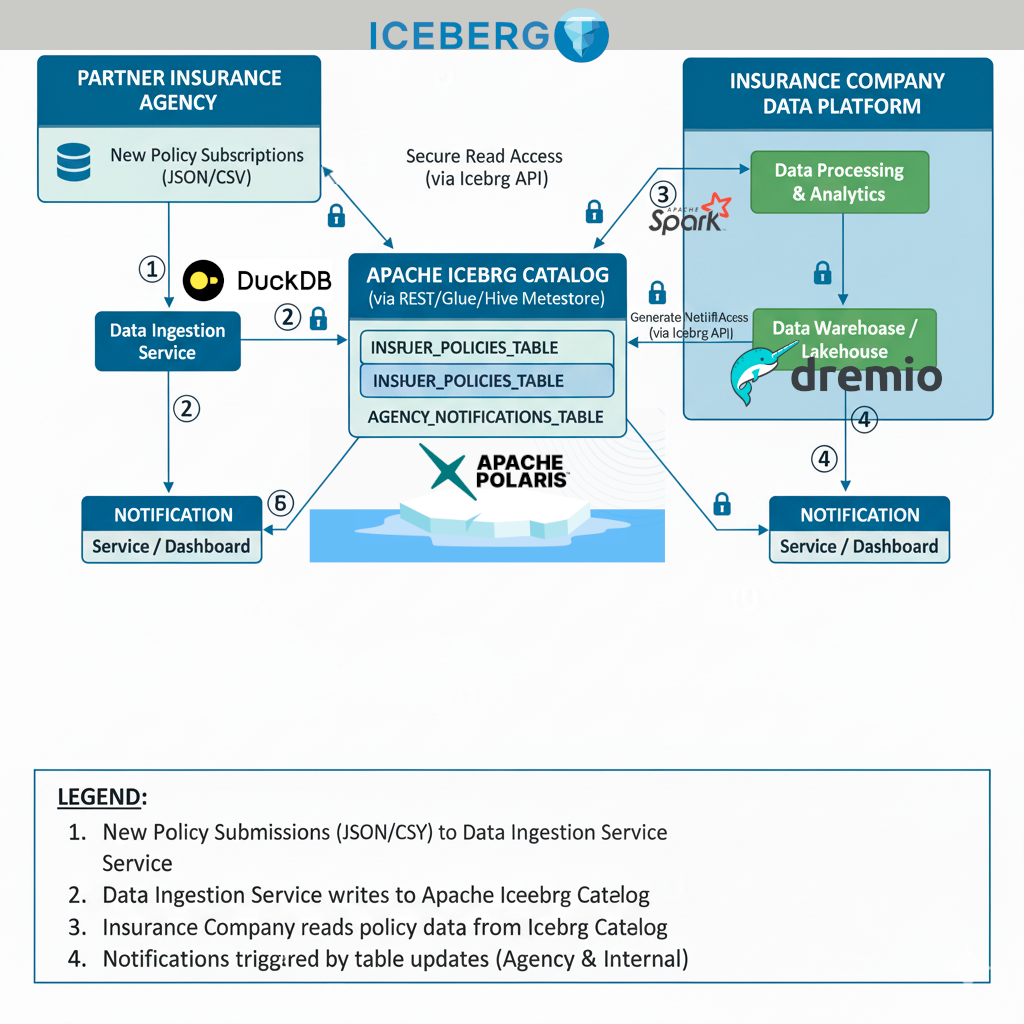 Nous arrivons au terme de notre démonstration. Un producteur de données par exemple une agence adhérente d’un réseau d’assurance vient remonter ses données du jour vers un catalogue central et sécurisé. Il pousse ses données avec son outil (client) DuckDB. La procédure est simple, rappeler les informations de connexion et partager les données sur la (les) tables qui sont autorisées. L’adhérent partage les données. L’assureur peut lire ces données par exemple avec Apache Spark et en retour partager des données à destination de l’adhérent.
