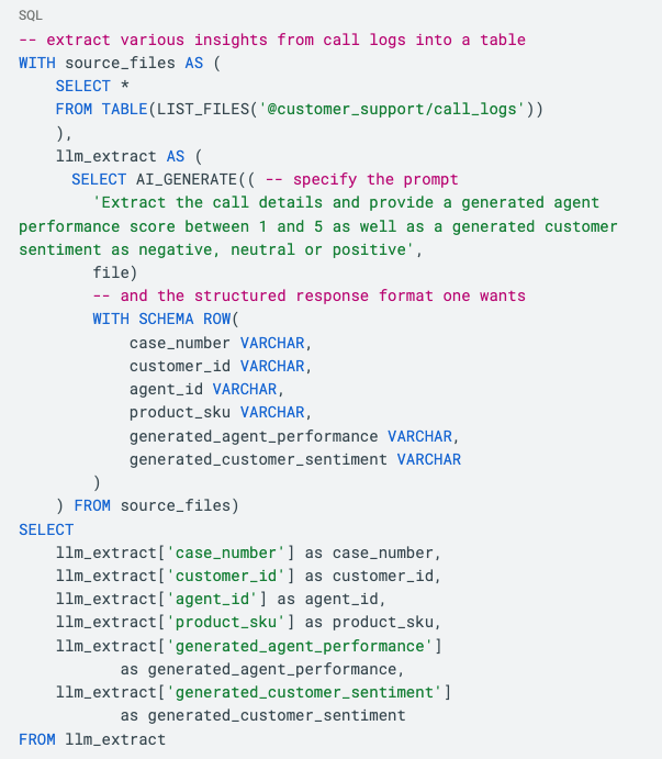 - Pilier de notre suite de fonctions d’IA, AI_GENERATE offre un traitement flexible et polyvalent des données non structurées. Cette fonction excelle dans les tâches d’extraction complexes nécessitant de multiples champs structurés à partir de fichiers sources, vous permettant de transformer des PDF, des documents et des images en données interrogeables avec une facilité sans précédent.