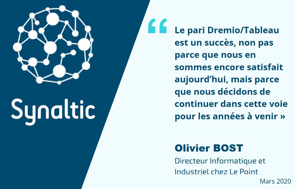 Synaltic accompagne Le Point dans le déploiement de son Data Hub, plate-forme de centralisation de données ainsi que l’utilisation de Dremio pour l’alimentation des tableaux de bord. Synaltic a travaillé avec les équipes de l’hebdomadaire ; de la conception des maquettes des tableaux jusqu’à leur déploiement et leur maintenance. Le travail effectué par Synaltic aura permis à Le Point de disposer de données agrégées et rapidement interrogeables. Ainsi, l’hebdomadaire peut non seulement fournir des analyses et des restitutions aux utilisateurs métiers, mais avoir aussi à portée de main toutes les données historisées pour créer des analyses ad-hoc plus poussées.