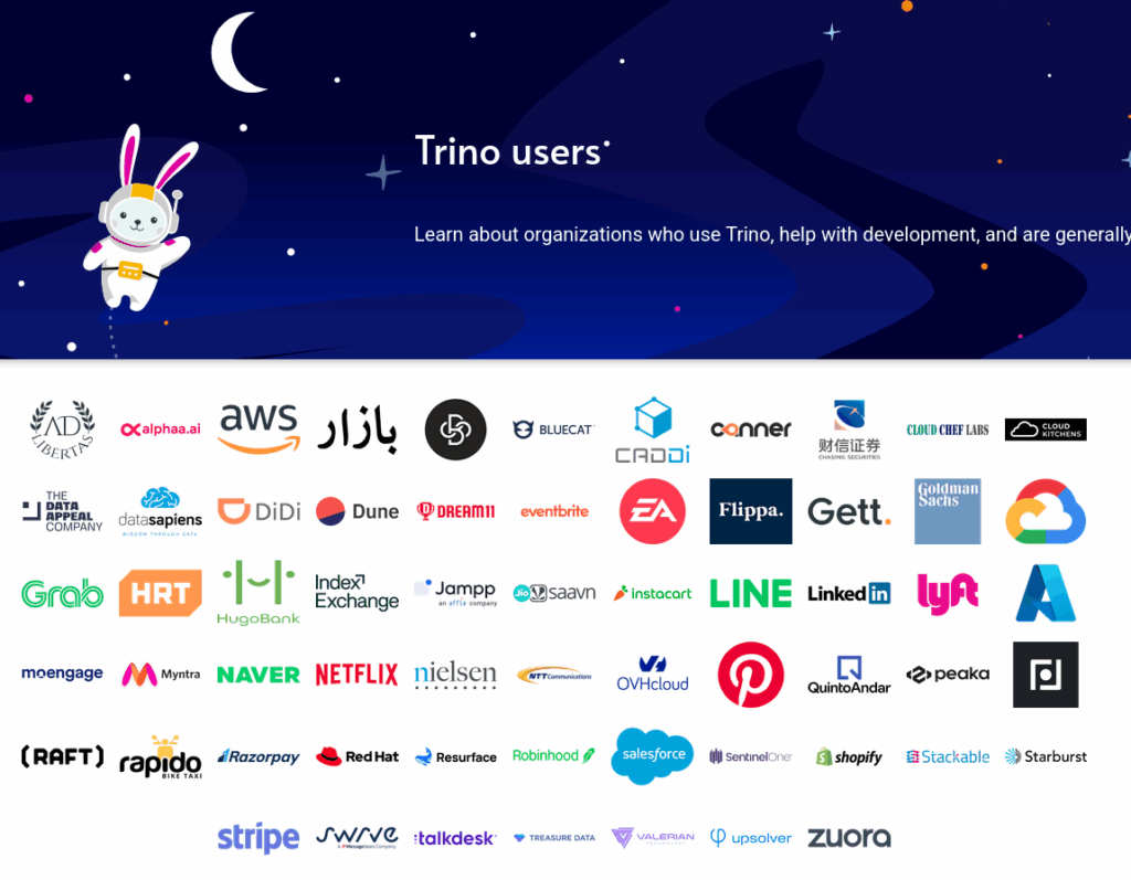 L’écosystème Trino est robuste : projet open source dynamique (plus de 30 versions, 40 000+ commits), adopté par de grandes entreprises (Netflix, Lyft, Salesforce, LinkedIn) et intégré à des plateformes comme Amazon EMR et Athena, Qubole.