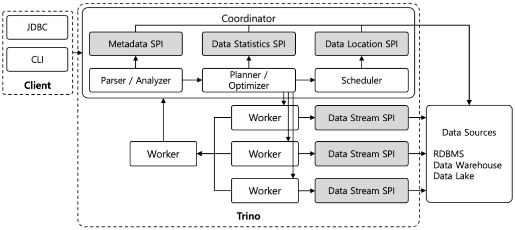 - Un point de défaillance unique : Si le coordinateur s’arrête ou redémarre, toutes les informations sont perdues et doivent être rechargées. Trino est alors temporairement lent au démarrage (on parle de « cold starts« ).