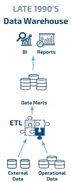 Pour stocker et gérer les données, nous avons traditionnellement mis en place des entrepôts de données (ou data warehouse). Le principe de collecter la donnée, de l’enrichir par association, nettoyage ou calcul, et d’en assurer la cohérence. Pour supporter ces fonctionnalités, plusieurs solutions ETL (extract, transform, load) ont vues le jour … et dominent aujourd’hui le marché.